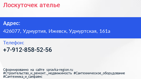 Лоскуточек, ателье по адресу 426077, Удмуртия, Ижевск, Удмуртская, 161а в дальнейшем Организация, размещена в следующих категориях: