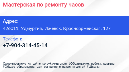 Мастерская по ремонту часов по адресу 426011, Удмуртия, Ижевск, Красноармейская, 127 в дальнейшем Организация, размещена в следующих категориях: