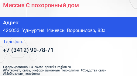 Миссия-С, похоронный дом по адресу 426053, Удмуртия, Ижевск, Ворошилова, 83а в дальнейшем Организация, размещена в следующих категориях: