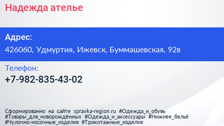 Надежда, ателье по адресу 426060, Удмуртия, Ижевск, Буммашевская, 92в в дальнейшем Организация, размещена в следующих категориях: