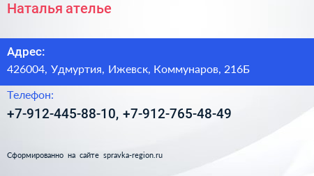 Наталья, ателье по адресу 426004, Удмуртия, Ижевск, Коммунаров, 216Б в дальнейшем Организация, размещена в следующих категориях: