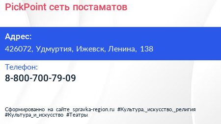 PickPoint, сеть постаматов по адресу 426072, Удмуртия, Ижевск, Ленина, 138 в дальнейшем Организация, размещена в следующих категориях: