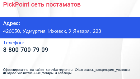 PickPoint, сеть постаматов по адресу 426050, Удмуртия, Ижевск, 9 Января, 223 в дальнейшем Организация, размещена в следующих категориях: