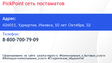 PickPoint, сеть постаматов по адресу 426011, Удмуртия, Ижевск, 10 лет Октября, 32 в дальнейшем Организация, размещена в следующих категориях: