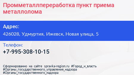 Промметаллпереработка, пункт приема металлолома по адресу 426028, Удмуртия, Ижевск, Новая улица, 5 в дальнейшем Организация, размещена в следующих категориях: