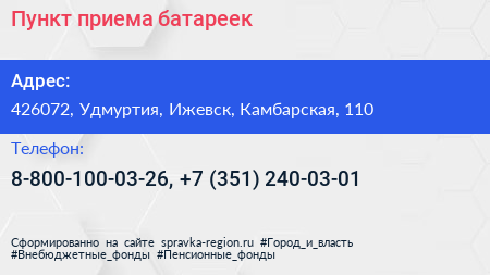 Пункт приема батареек по адресу 426072, Удмуртия, Ижевск, Камбарская, 110 в дальнейшем Организация, размещена в следующих категориях: