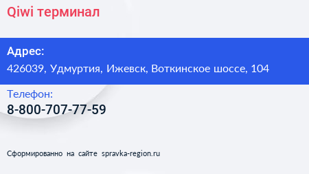 Qiwi, терминал по адресу 426039, Удмуртия, Ижевск, Воткинское шоссе, 104 в дальнейшем Организация, размещена в следующих категориях: