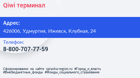 Qiwi, терминал по адресу 426006, Удмуртия, Ижевск, Клубная, 24 в дальнейшем Организация, размещена в следующих категориях: