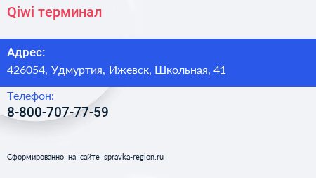 Qiwi, терминал по адресу 426054, Удмуртия, Ижевск, Школьная, 41 в дальнейшем Организация, размещена в следующих категориях: