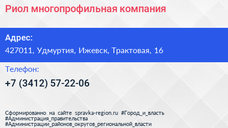 Риол, многопрофильная компания по адресу 427011, Удмуртия, Ижевск, Трактовая, 16 в дальнейшем Организация, размещена в следующих категориях:
