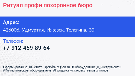 Ритуал-профи, похоронное бюро по адресу 426006, Удмуртия, Ижевск, Телегина, 30 в дальнейшем Организация, размещена в следующих категориях: