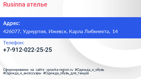 Rusinna, ателье по адресу 426077, Удмуртия, Ижевск, Карла Либкнехта, 14 в дальнейшем Организация, размещена в следующих категориях: