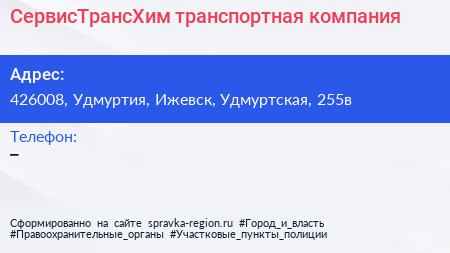 СервисТрансХим, транспортная компания по адресу 426008, Удмуртия, Ижевск, Удмуртская, 255в в дальнейшем Организация, размещена в следующих категориях: