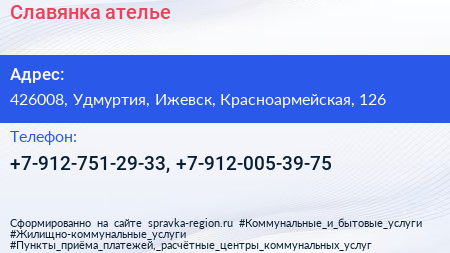 Славянка, ателье по адресу 426008, Удмуртия, Ижевск, Красноармейская, 126 в дальнейшем Организация, размещена в следующих категориях: