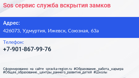 Sos-сервис, служба вскрытия замков по адресу 426073, Удмуртия, Ижевск, Союзная, 63а в дальнейшем Организация, размещена в следующих категориях: