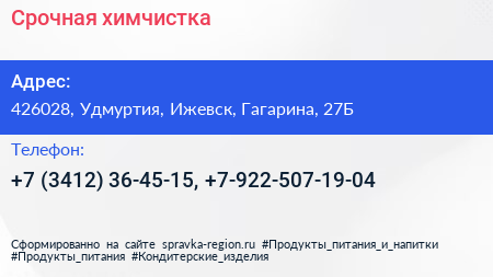 Срочная химчистка по адресу 426028, Удмуртия, Ижевск, Гагарина, 27Б в дальнейшем Организация, размещена в следующих категориях: