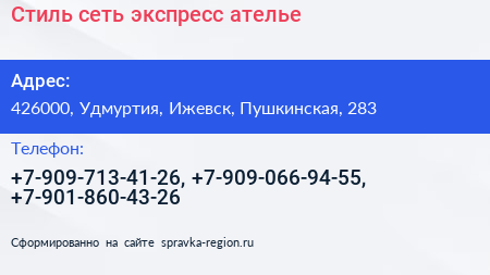 Стиль, сеть экспресс-ателье по адресу 426000, Удмуртия, Ижевск, Пушкинская, 283 в дальнейшем Организация, размещена в следующих категориях: