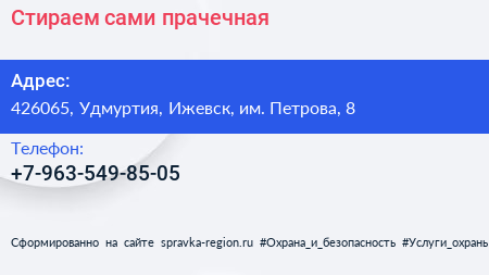 Стираем сами, прачечная по адресу 426065, Удмуртия, Ижевск, им. Петрова, 8 в дальнейшем Организация, размещена в следующих категориях:
