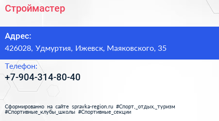 Строймастер по адресу 426028, Удмуртия, Ижевск, Маяковского, 35 в дальнейшем Организация, размещена в следующих категориях: