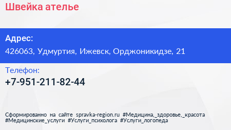 Швейка, ателье по адресу 426063, Удмуртия, Ижевск, Орджоникидзе, 21 в дальнейшем Организация, размещена в следующих категориях: