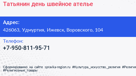 Татьянин день, швейное ателье по адресу 426063, Удмуртия, Ижевск, Воровского, 104 в дальнейшем Организация, размещена в следующих категориях: