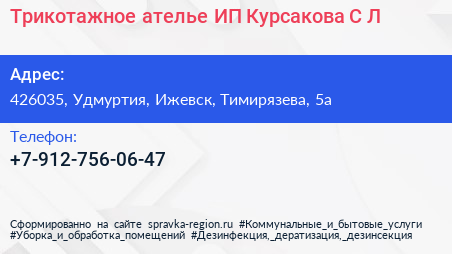 Трикотажное ателье, ИП Курсакова С.Л. по адресу 426035, Удмуртия, Ижевск, Тимирязева, 5а в дальнейшем Организация, размещена в следующих категориях: