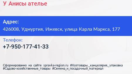 У Анисы, ателье по адресу 426008, Удмуртия, Ижевск, улица Карла Маркса, 177 в дальнейшем Организация, размещена в следующих категориях: