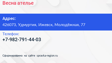 Весна, ателье по адресу 426073, Удмуртия, Ижевск, Молодёжная, 77 в дальнейшем Организация, размещена в следующих категориях: