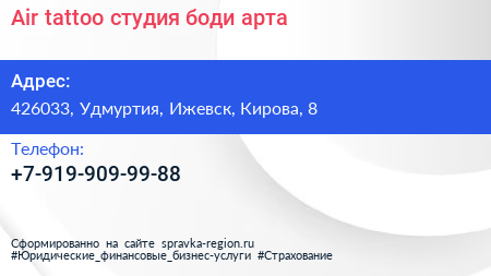 Air tattoo, студия боди-арта по адресу 426033, Удмуртия, Ижевск, Кирова, 8 в дальнейшем Организация, размещена в следующих категориях: