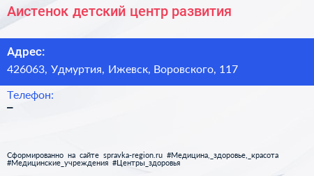 Аистенок, детский центр развития по адресу 426063, Удмуртия, Ижевск, Воровского, 117 в дальнейшем Организация, размещена в следующих категориях:
