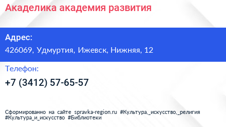 Акаделика, академия развития по адресу 426069, Удмуртия, Ижевск, Нижняя, 12 в дальнейшем Организация, размещена в следующих категориях: