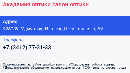 Академия оптики, салон оптики по адресу 426039, Удмуртия, Ижевск, Дзержинского, 59 в дальнейшем Организация, размещена в следующих категориях: