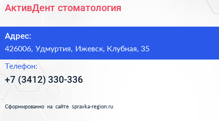 АктивДент, стоматология по адресу 426006, Удмуртия, Ижевск, Клубная, 35 в дальнейшем Организация, размещена в следующих категориях: