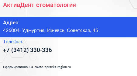АктивДент, стоматология по адресу 426004, Удмуртия, Ижевск, Советская, 45 в дальнейшем Организация, размещена в следующих категориях: