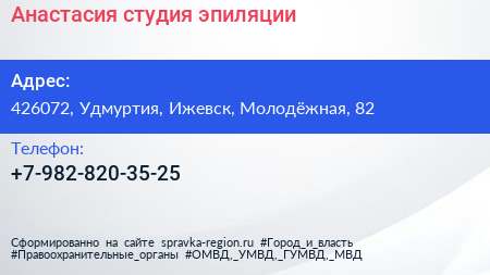 Анастасия, студия эпиляции по адресу 426072, Удмуртия, Ижевск, Молодёжная, 82 в дальнейшем Организация, размещена в следующих категориях: