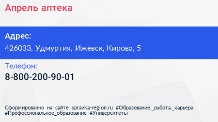 Апрель, аптека по адресу 426033, Удмуртия, Ижевск, Кирова, 5 в дальнейшем Организация, размещена в следующих категориях: