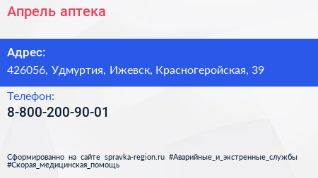 Апрель, аптека по адресу 426056, Удмуртия, Ижевск, Красногеройская, 39 в дальнейшем Организация, размещена в следующих категориях: