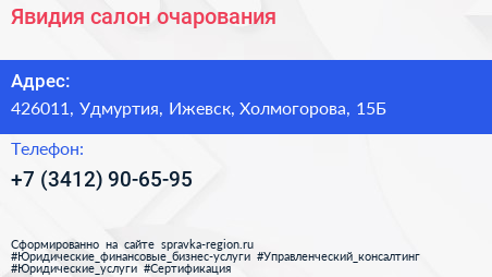 Явидия, салон очарования по адресу 426011, Удмуртия, Ижевск, Холмогорова, 15Б в дальнейшем Организация, размещена в следующих категориях: