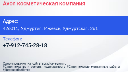 Avon, косметическая компания по адресу 426011, Удмуртия, Ижевск, Удмуртская, 261 в дальнейшем Организация, размещена в следующих категориях: