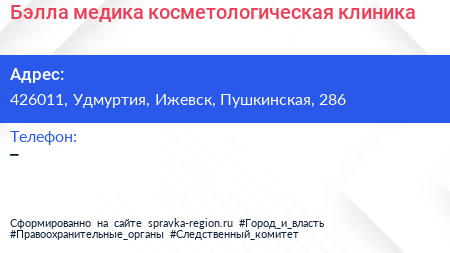 Бэлла медика, косметологическая клиника по адресу 426011, Удмуртия, Ижевск, Пушкинская, 286 в дальнейшем Организация, размещена в следующих категориях: