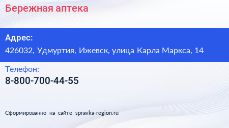 Бережная аптека по адресу 426032, Удмуртия, Ижевск, улица Карла Маркса, 14 в дальнейшем Организация, размещена в следующих категориях: