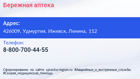 Бережная аптека по адресу 426009, Удмуртия, Ижевск, Ленина, 112 в дальнейшем Организация, размещена в следующих категориях: