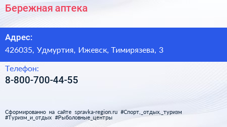Бережная аптека по адресу 426035, Удмуртия, Ижевск, Тимирязева, 3 в дальнейшем Организация, размещена в следующих категориях: