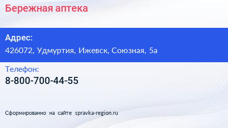 Бережная аптека по адресу 426072, Удмуртия, Ижевск, Союзная, 5а в дальнейшем Организация, размещена в следующих категориях: