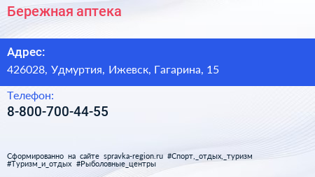 Бережная аптека по адресу 426028, Удмуртия, Ижевск, Гагарина, 15 в дальнейшем Организация, размещена в следующих категориях: