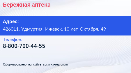 Бережная аптека по адресу 426011, Удмуртия, Ижевск, 10 лет Октября, 49 в дальнейшем Организация, размещена в следующих категориях: