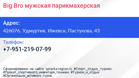 Big Bro, мужская парикмахерская по адресу 426076, Удмуртия, Ижевск, Пастухова, 43 в дальнейшем Организация, размещена в следующих категориях: