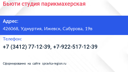 Бьюти, студия-парикмахерская по адресу 426068, Удмуртия, Ижевск, Сабурова, 19в в дальнейшем Организация, размещена в следующих категориях: