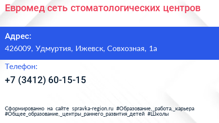 Евромед, сеть стоматологических центров по адресу 426009, Удмуртия, Ижевск, Совхозная, 1а в дальнейшем Организация, размещена в следующих категориях: