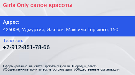 Girls Only, салон красоты по адресу 426008, Удмуртия, Ижевск, Максима Горького, 150 в дальнейшем Организация, размещена в следующих категориях:
